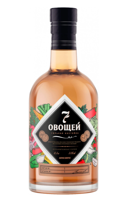 Способ производства: Настойка оздается путем холодного настаивания на свежих овощах в закрытой емкости в течение 3х недель. В составе настойки — семь овощей: сладкий и острый перцы, сельдерей, лук-порей, морковь, чеснок и зелень. Овощи для приготовления настойки отбираются в лучших фермерских хозяйствах юга России.